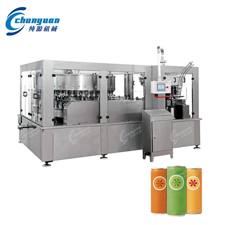 果汁易拉罐灌装机是专为铝制或马口铁易拉罐(通常容量为 200ml、250ml、330ml、500ml)设计的全自动高速灌装设备,适用于非碳酸、热灌装型果汁、茶饮料、植物蛋白饮料、功能性饮品等。由于易拉罐不耐高压且需常温或热灌装,其灌装工艺与碳酸饮料(如啤酒、汽水)有显著区别。果汁易拉罐灌装通常采用 “UHT灭菌 + 热灌装 + 封罐 + 倒罐杀菌 + 冷却” 工艺,以实现商业无菌和常温长期保存(保质期6–12个月)。
